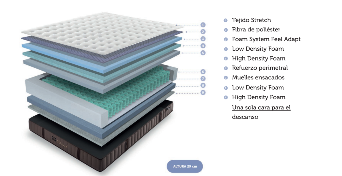 El colchón Cloud de Sealy combina viscoelásticas de diferentes densidades con el sistema Foam System Feel Adapt, que proporciona un confort progresivo que se adaptándose a cada cuerpo sin renunciar a la firmeza estructural.