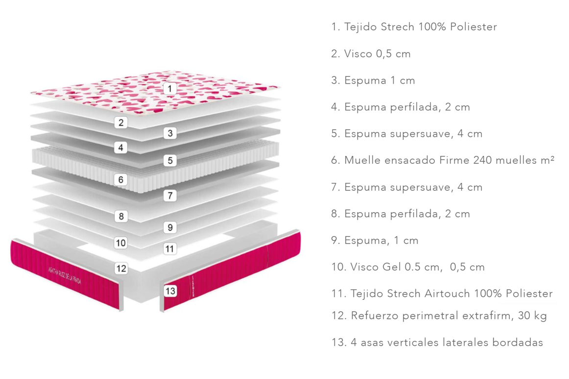 Cuore tiene una firmeza alta con una adaptación media, posee una transpirabilidad alta con poca acumulación de calor. Esta formado por una carcasa de muelles ensacados firmes que le aportan estabilidad y firmeza. La combinación de capas de Viscoelástica y de Gel Foam aportan un excelente confort al mismo.